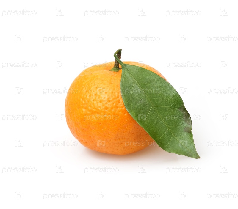 Мандарин со свежими зелеными веточками, изолированные на белом фоне