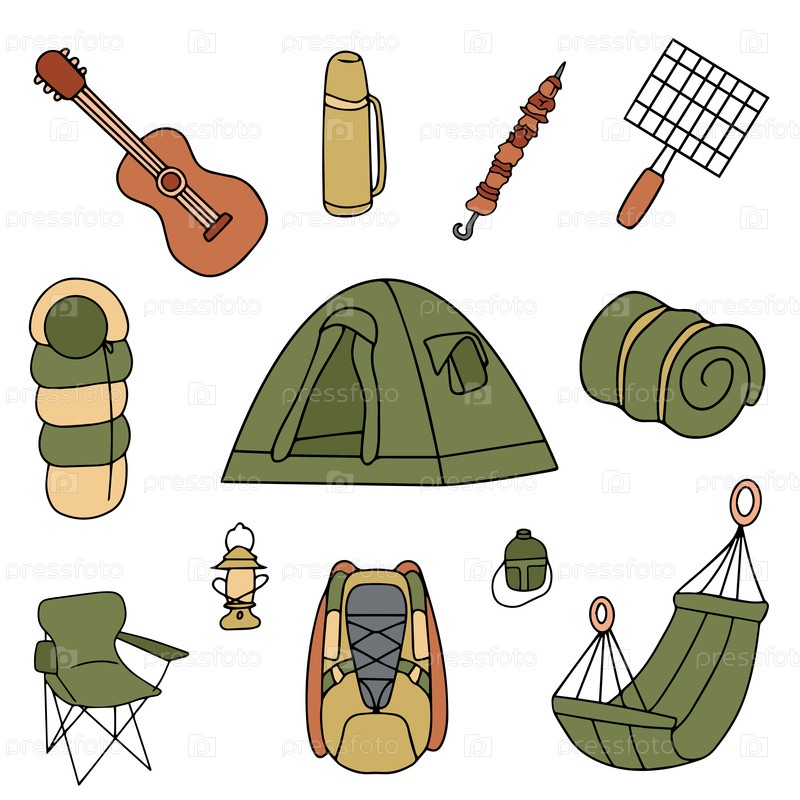 Пикник и барбекю веб-иконки. Набор ярких красочных символов в стиле каракули для летней темы отдыха на свежем воздухе