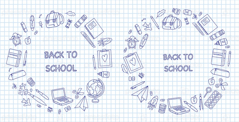 Баннеры «Назад в школу». Набор канцелярских принадлежностей, нарисованных вручную. Школьные принадлежности в стиле каракулей на клетчатом фоне