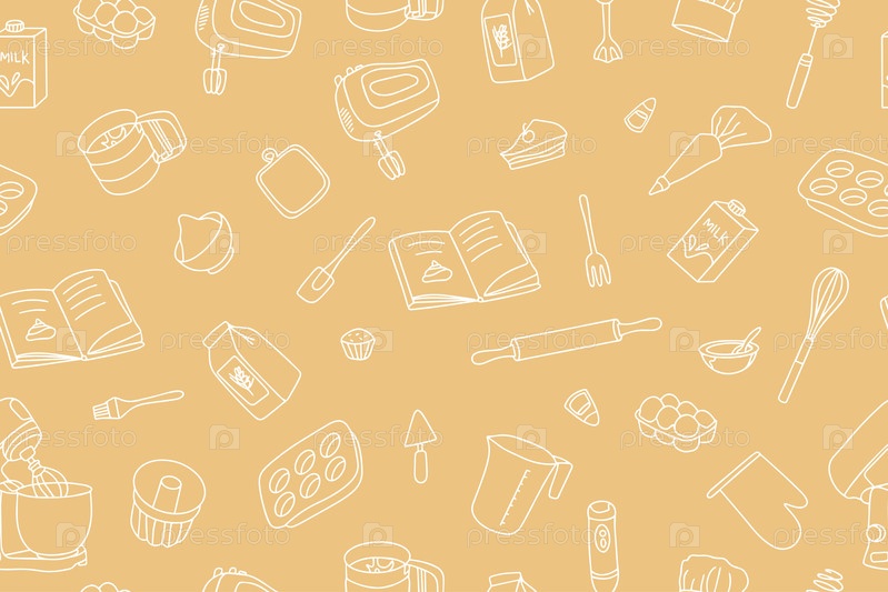 Бесшовный узор из принадлежностей для выпечки. Кухонная утварь в стиле каракули на бежевом фоне. Модный современный принт для вашего дизайна. Вектор