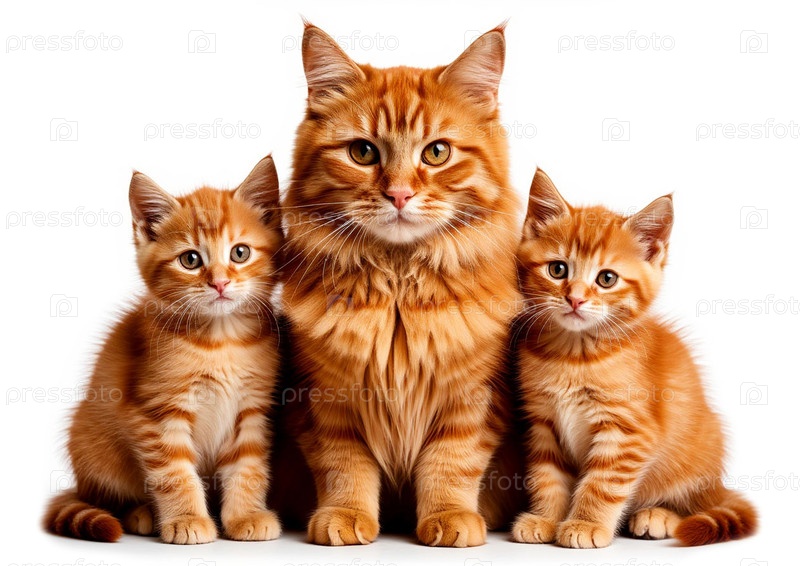 Рыжая кошка с котятами на белом фоне — сгенерирована искусственным интеллектом
