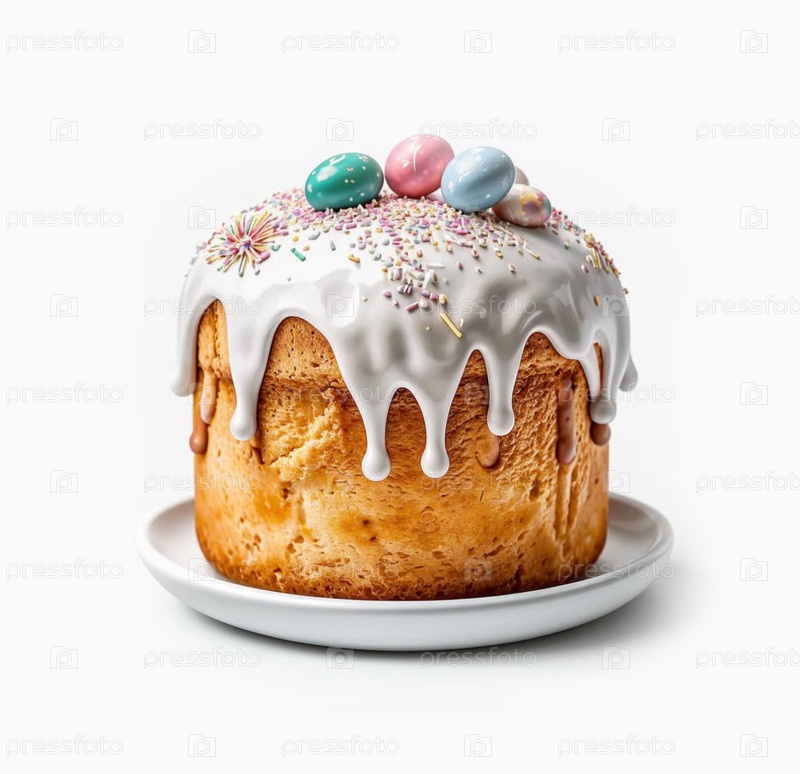 Свежий пасхальный кулич с посыпкой и глазурью на изолированном белом фоне