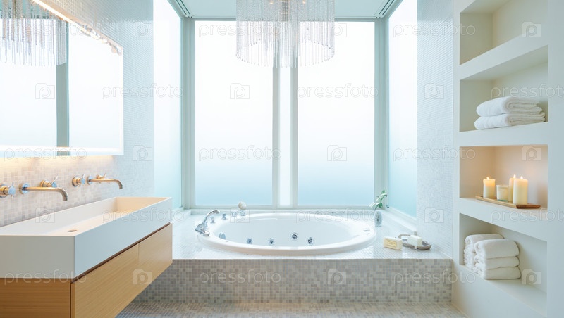 Интерьер ванной комнаты с джакузи в легком модном стиле - создано с помощью ИИ