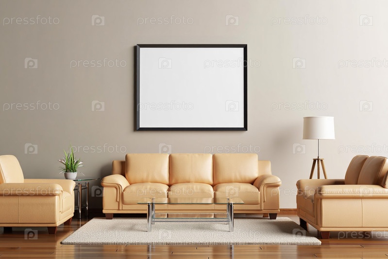 Гостиная в бежевых тонах с кожаным диваном и макетом картины, созданным с помощью искусственного интеллекта