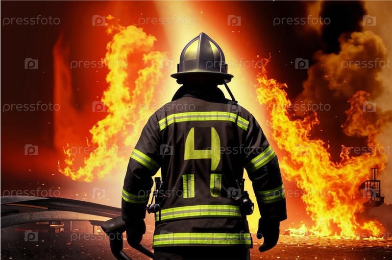 Пожарный в форме и каске, вид со спины на фоне огня и дыма