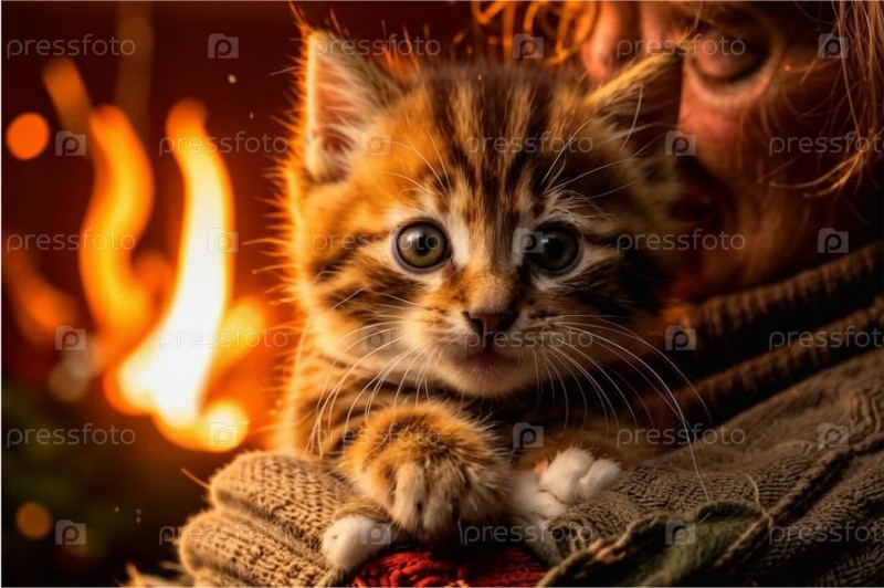 Старушка с котенком на руках на фоне огня и дыма. Огонь и спасение жизней людей и животных