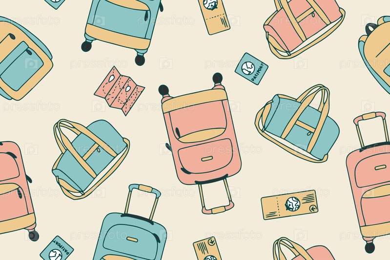 Бесшовный узор чемоданов, сумок, рюкзаков для путешествий в стиле doodle. Нарисованные от руки значки багажа