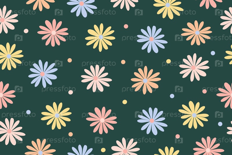 Яркий бесшовный узор из цветов ромашки. Векторный дизайн для фона, текстиля, канцелярских товаров, оберточной бумаги, обложки. Красивые цветы на зеленом фоне. Вектор
