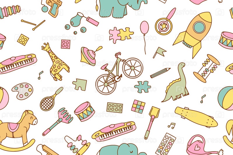 Бесшовный узор с детскими игрушками на белом фоне. Дизайн для упаковочной бумаги, текстиля, детской одежды, обоев, упаковки. Векторная иллюстрация