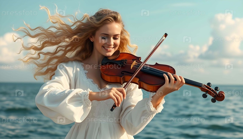 Молодая красивая женщина играет на скрипке. Генеративный ИИ
