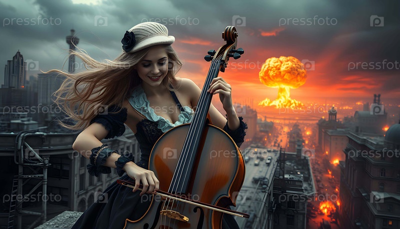 Молодая женщина играет на виолончели в разрушенном городе AI Generatve