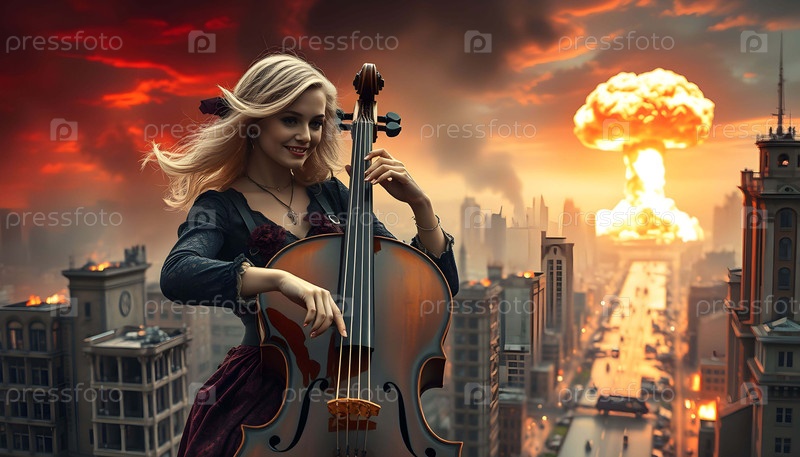 Молодая женщина играет на виолончели в заброшенном городе. Генеративный искусственный интеллект