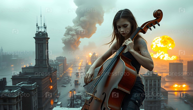 Молодая женщина играет на виолончели в заброшенном городе. Генеративный искусственный интеллект