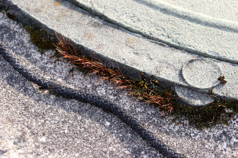 Каменная крышка колодца, зернистая текстура камня со мхом и веревкой