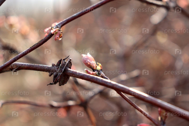 Ветка необычной формы с цветущими почками на кусте жимолости