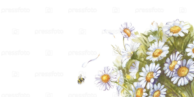 Горизонтальная рамка с букетом ромашек, лепестками и маленьким шмелем расписана вручную. Акварельная иллюстрация. Пустое место для вашей этикетки. Летний дизайн