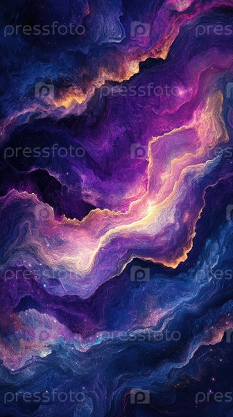 Закрученные линии и волны в глубоких фиолетовых и синих тонах вызывают ощущение космической энергии. Звездное сияние усиливает футуристическую и элегантную эстетику, приглашая к захватывающему визуальному опыту