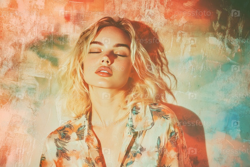 Гламурная блондинка в ретро-коллаже с мягким золотистым светом и цветочной шелковой рубашкой