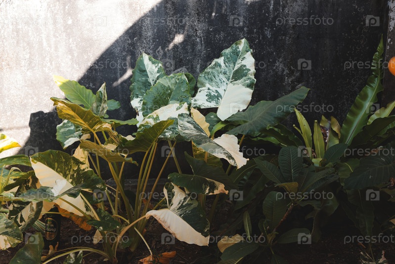 Зелень в яркой городской обстановке. Пышные растения прекрасно контрастируют с темной стеной