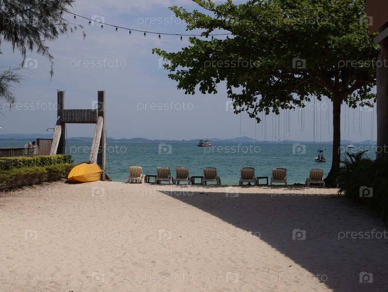 Красивый и расслабляющий пляж с шезлонгами и живописным, умиротворяющим видом