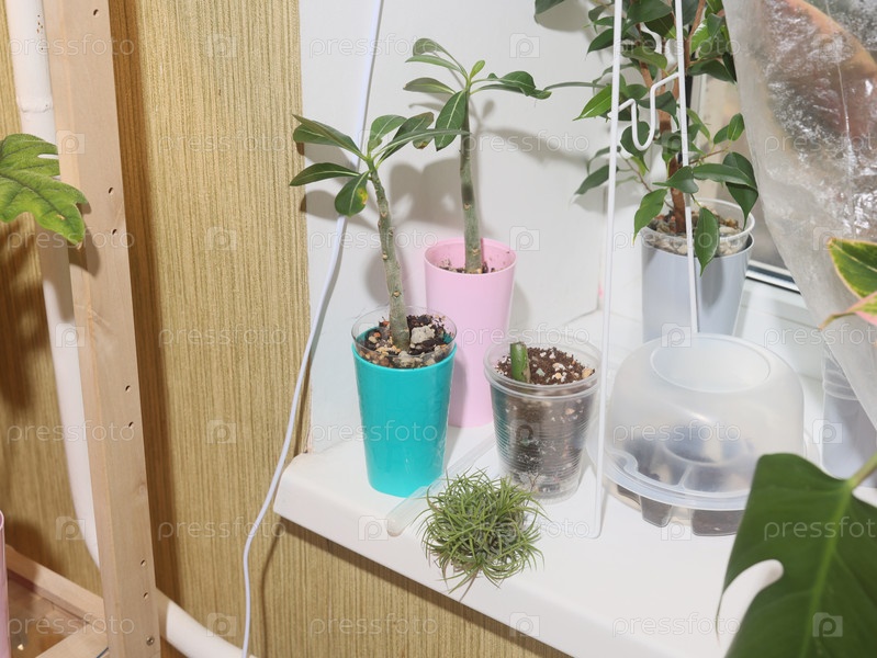Композиция из комнатных растений на солнечном подоконнике с разнообразными горшками и кашпо