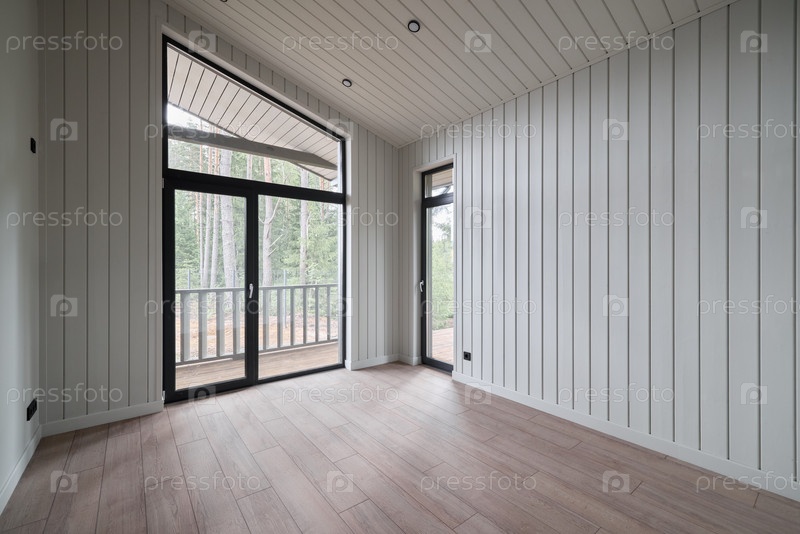Современный интерьер комнаты без мебели с большими окнами для хорошего освещения