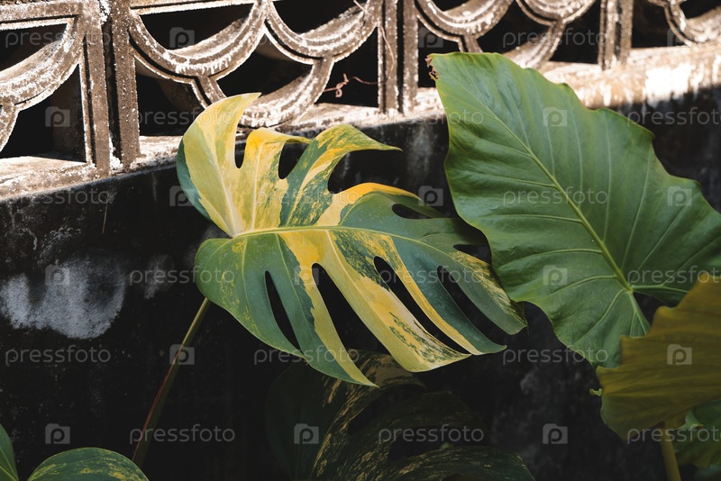Яркие и красивые зеленые тропические листья величественно расположены на фактурной поверхности стены