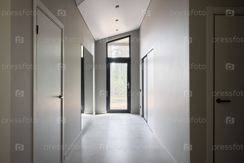 Потрясающий современный коридор с большими окнами и современным минималистским дизайном