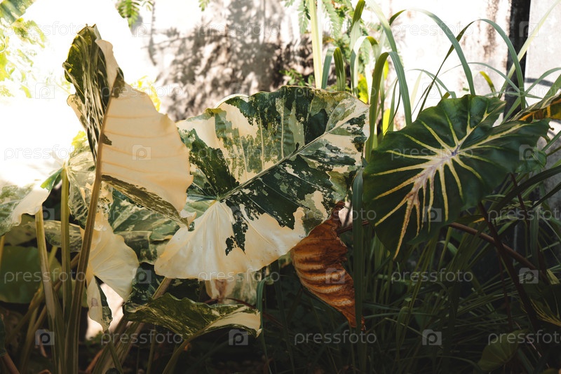 Пышные и яркие зеленые тропические растения прекрасно цветут под ярким естественным светом