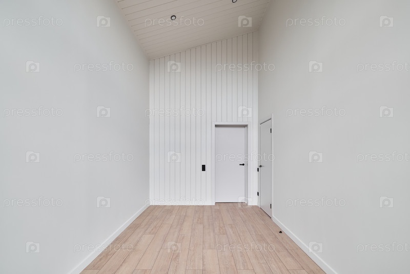 Современный минималистский дизайн интерьера с высоким потолком и красивым деревянным полом
