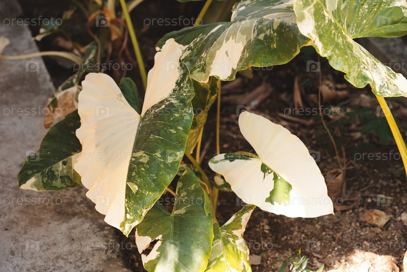 Фантастическое пышное зеленое растение с характерными и уникальными узорами и рисунками листьев. Алоказия