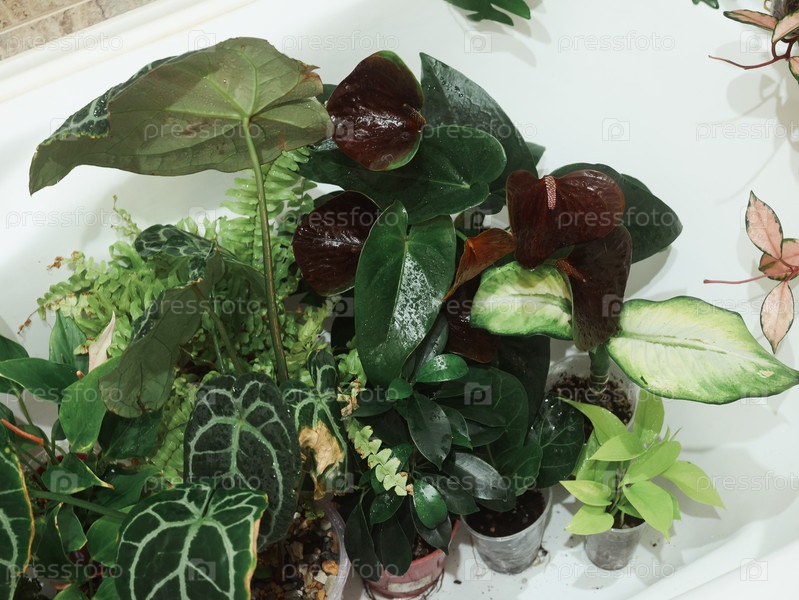 Пышная оранжерея с разнообразными комнатными растениями, расположенными в ванной комнате
