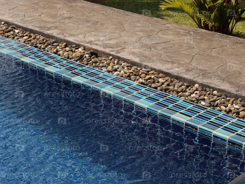 Красивый бассейн с современной плиткой и бортиком из натурального камня для релаксации