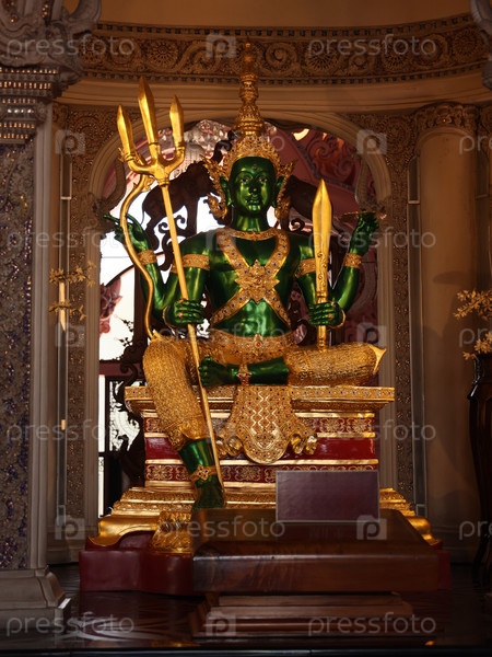 Величественная зеленая статуя божества, элегантно украшенная золотыми акцентами в спокойной храмовой обстановке