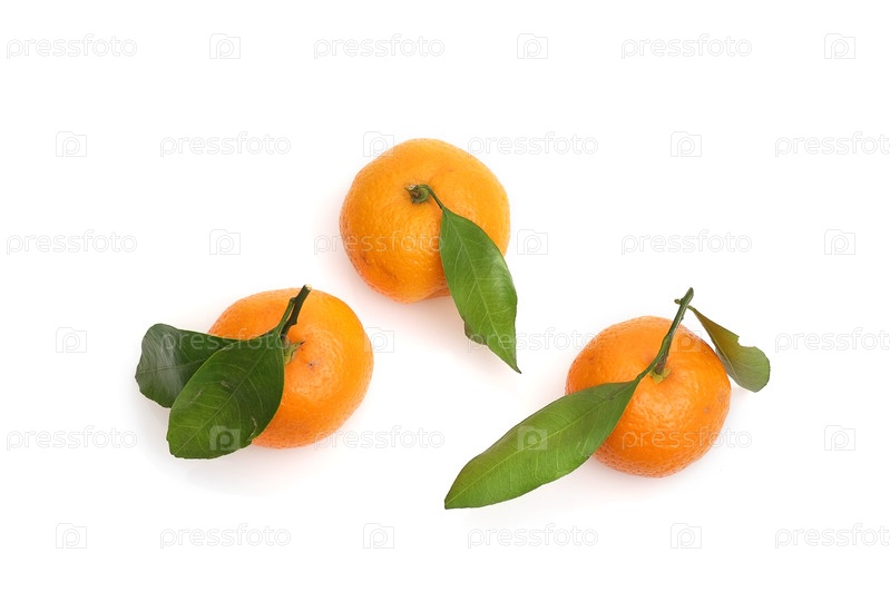 Мандарины со свежими зелеными веточками, изолированные на белом фоне