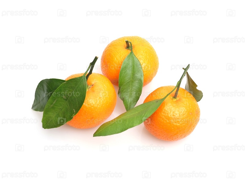 Мандарины со свежими зелеными веточками, изолированные на белом фоне