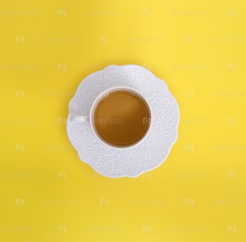 Фарфоровая чашка с чаем на желтом фоне. Элемент дизайна с маской обрезки