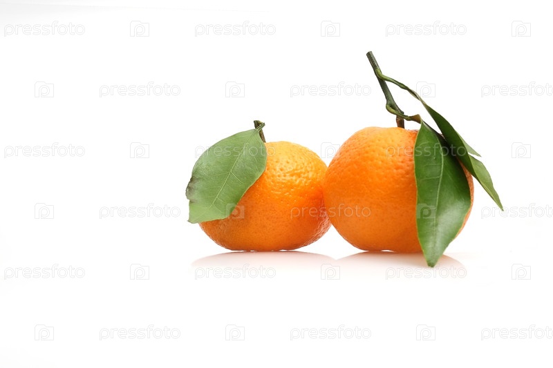 Мандарины со свежими зелеными веточками, изолированные на белом фоне