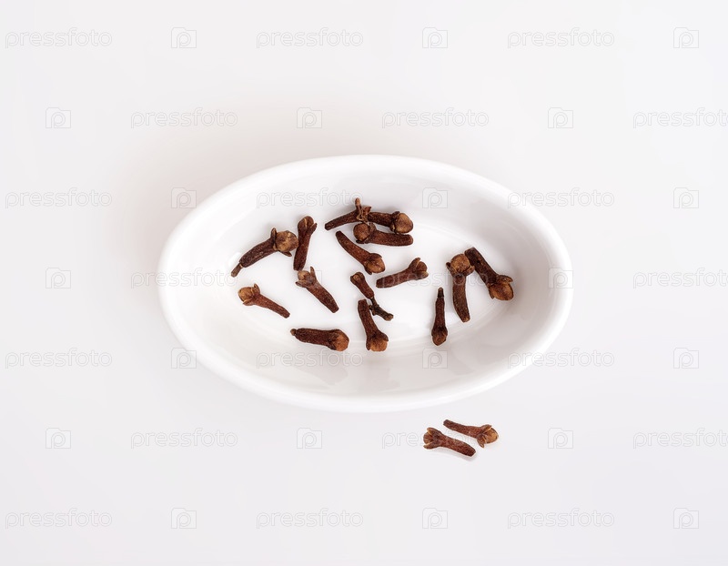 Сушеные гвоздики в белых блюдах, изолированные на белом фоне