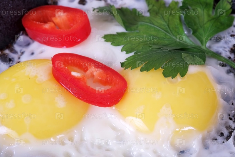 Яичница с зеленью и паприкой на белом фоне