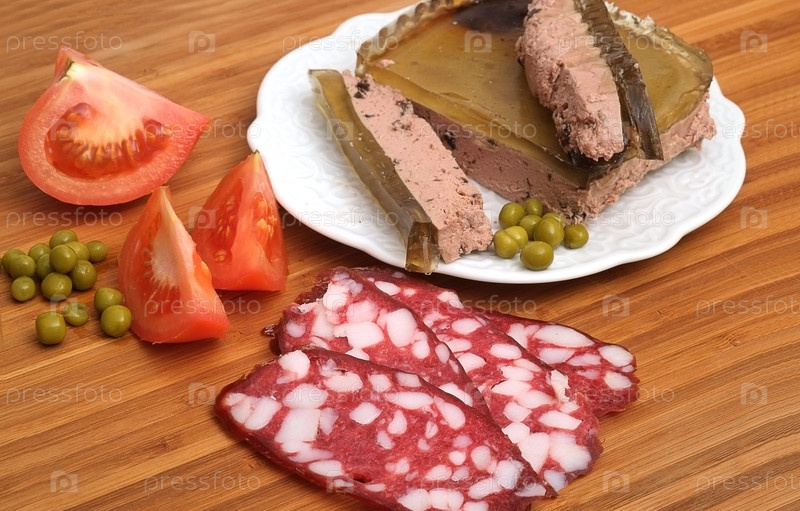 Паштет, помидоры и зеленый горошек на деревянном столе