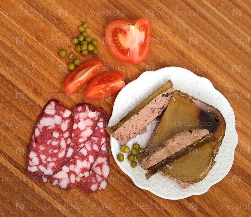 Паштет, помидоры и зеленый горошек на деревянном столе