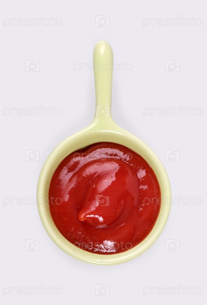 Небольшая пробная порция классического кетчупа на блюде, изолированном на белом фоне. Элемент дизайна с обтравочным контуром