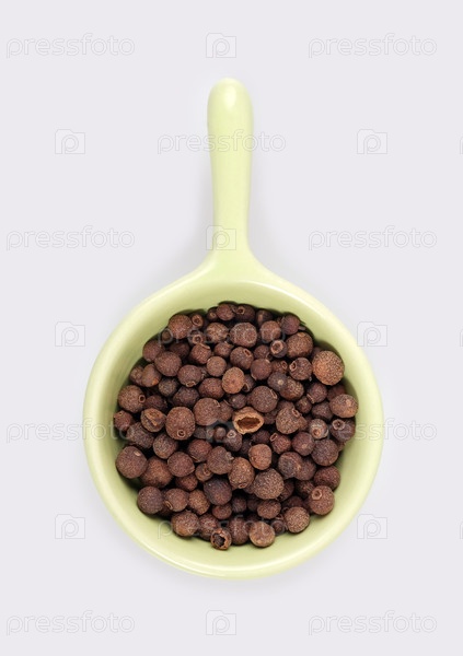 Небольшая пробная порция душистого перца на блюде, изолированном на белом фоне. Элемент дизайна с обтравочным контуром