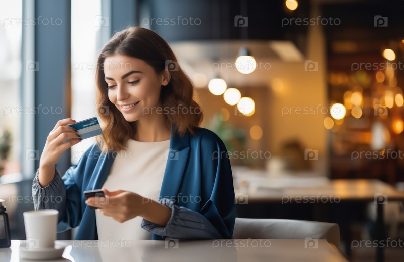 Молодая женщина использует современные платежные технологии с помощью кредитной карты в кафе.Сгенерированное изображение