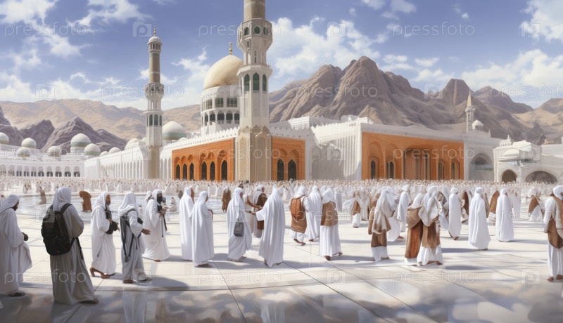 Мусульмане совершают хадж в одеждах ихрама во время священного паломничества.Сгенерированное изображение