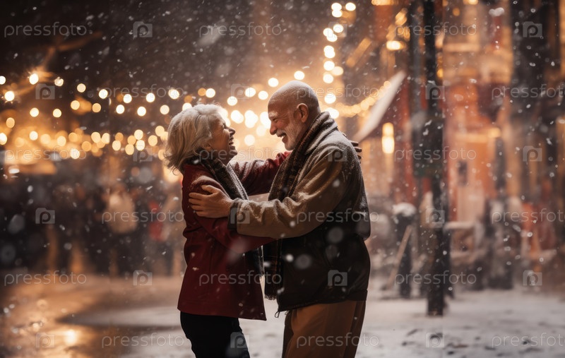 В безмятежном снегопаде пожилая пара сердечно обнимается, окутанная теплым сиянием любви в зимнюю ночь