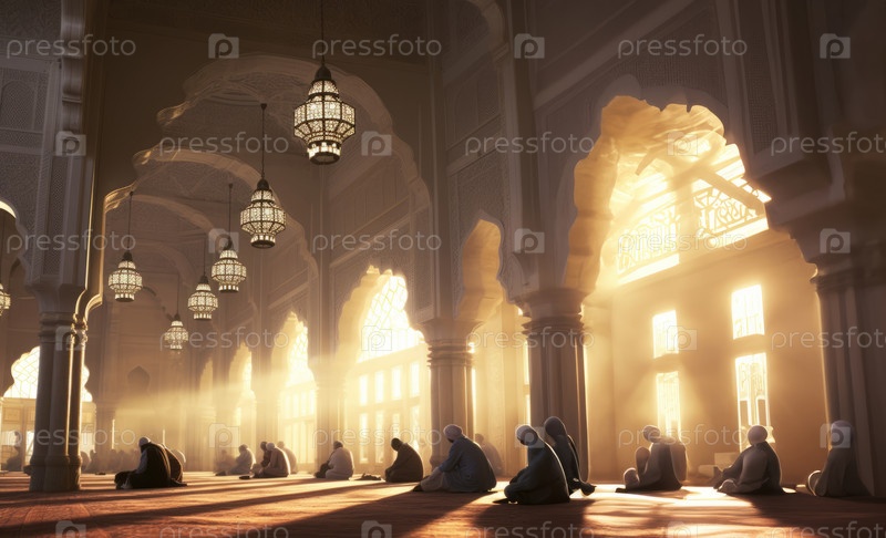 Группа мусульман молится в мечети, солнечный свет струится через окно, создавая силуэты.Сгенерированное изображение