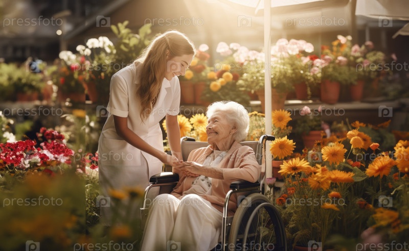 Сострадательный врач ухаживает за пожилой женщиной в инвалидной коляске, оказывая ей специализированную помощь и поддержку для улучшения самочувствия жительницы в спокойной обстановке на открытом воздухе.Сгенерированное изображение