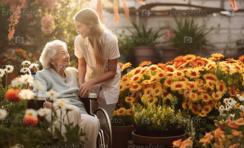 Сострадательный врач ухаживает за пожилой женщиной в инвалидной коляске, оказывая ей специализированную помощь и поддержку для улучшения самочувствия жительницы в спокойной обстановке на открытом воздухе.Сгенерированное изображение